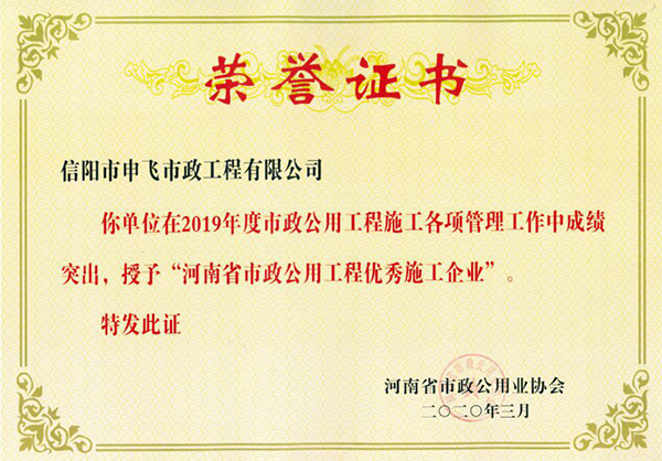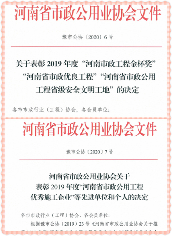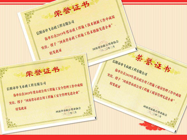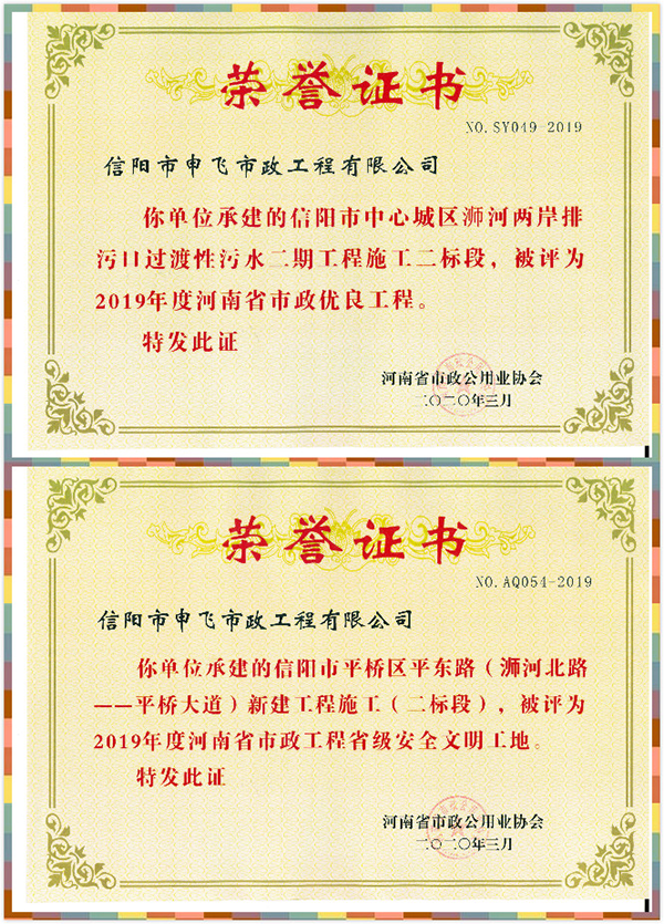 除省金杯獎(jiǎng)之外,公司承建的中心城區(qū)浉河兩岸排污口過(guò)渡性污水污水二期工程二標(biāo)段被評(píng)為“河南省市政優(yōu)良工程”,平橋區(qū)平東路(浉河北路-平橋大道)新建工程(二標(biāo)段)被評(píng)為2019年度“市政工程省級(jí)安全文明工地”。