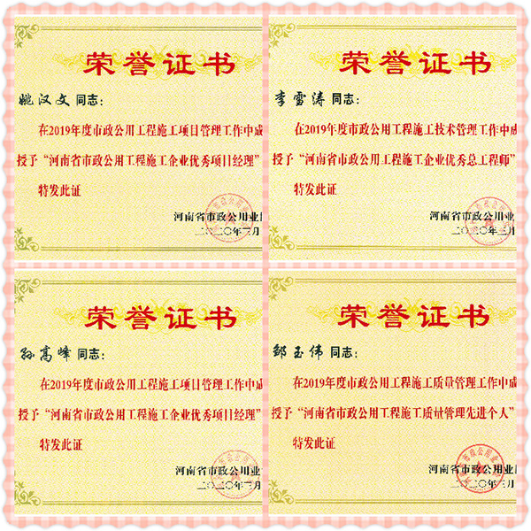同時(shí),公司多人分別獲得“河南省市政公用工程施工企業(yè)優(yōu)秀總工程師”、“河南省市政公用工程施工企業(yè)優(yōu)秀項(xiàng)目經(jīng)理”、“河南省市政公用工程施工質(zhì)量管理先進(jìn)個(gè)人”等榮譽(yù)稱(chēng)號(hào)。市政公司始終堅(jiān)持高標(biāo)準(zhǔn),嚴(yán)要求,精心管理,狠抓質(zhì)量要點(diǎn),科學(xué)施工,不論是工程硬件還是工程軟件都為此次授評(píng)奠定了堅(jiān)實(shí)的基礎(chǔ),為公司贏得了榮譽(yù)。