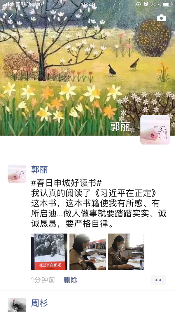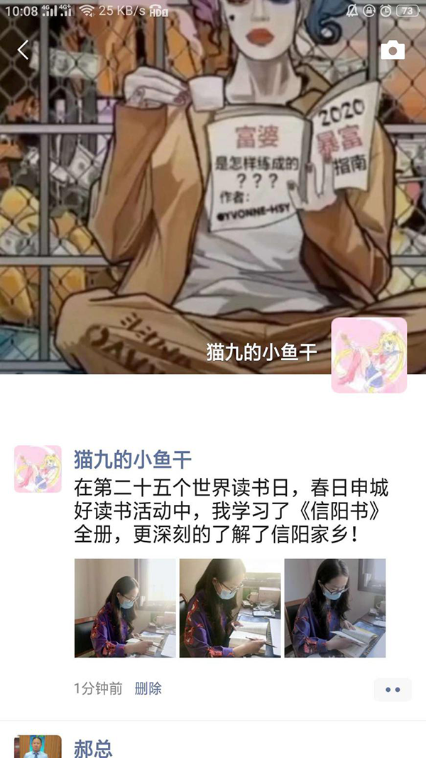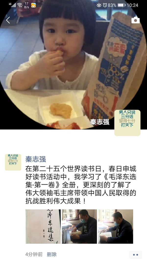 2020年4月23日是第25個世界讀書日,為號召網(wǎng)絡(luò)文明傳播,公司職工紛紛積極讀書,發(fā)布到微信朋友圈。